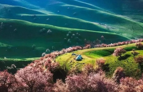 每到春季,隨著朝陽山坡上杏花的打苞和開花,站在山梁上放眼望去,杏樹滿山遍坡,千株萬棵,枝根相接;人入其中,隔數(shù)尺只聞其聲而不見其影。與別處的杏花不同,在新源吐爾根,含苞待放的野杏花呈現(xiàn)出嬌媚的粉紅色,與山間的綠色地毯相互映襯著。站在山梁放眼望去,連綿起伏的山坡上,千萬株野杏花競相開放,猶如害羞的哈薩克族少女。一樹一樹的花開,粉紅綴枝,香風漫漫,燦若云霞;置身其中,如赴花山花海,恍入仙境。
