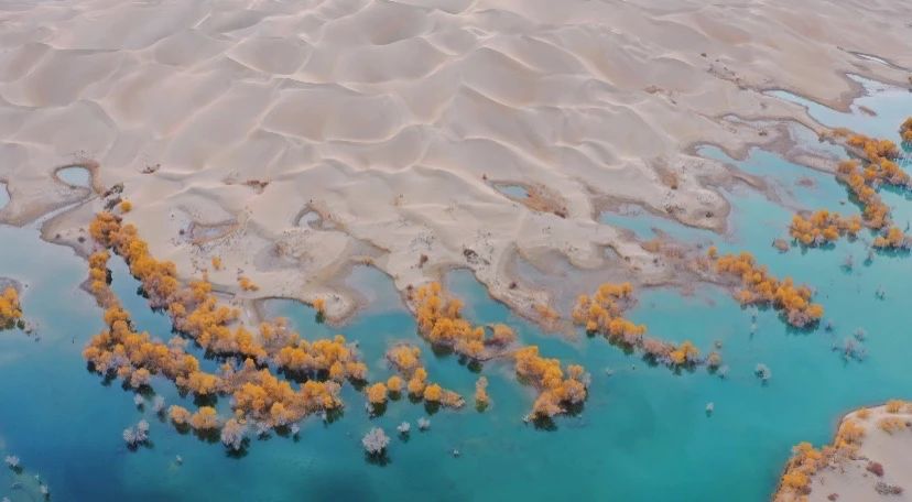 胡楊與沙漠、河流、戈壁、綠洲融為一體